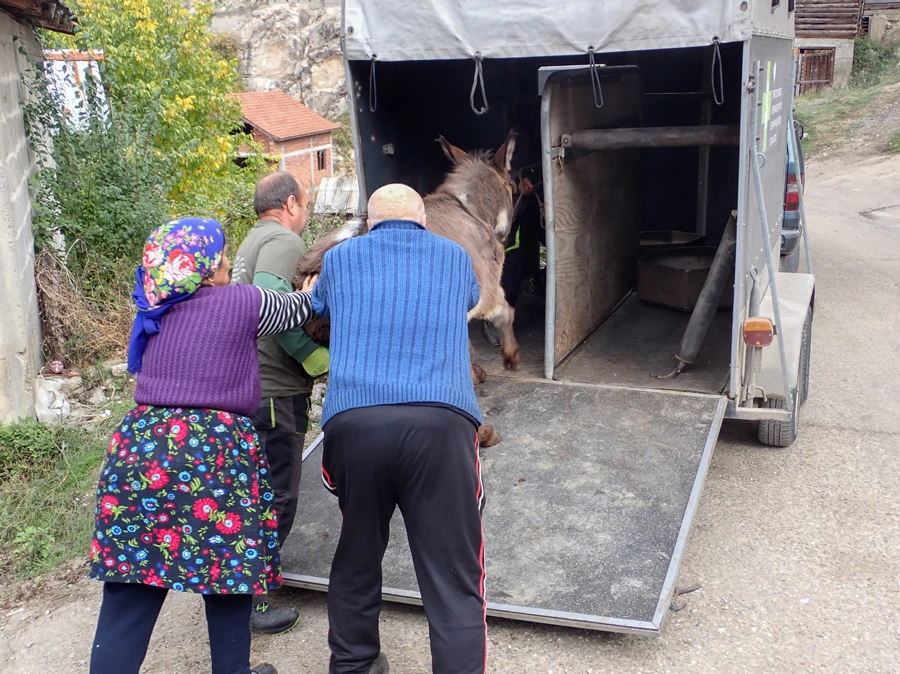 Oft ist dies der schwierigste Moment, hauptsächlich, wenn sich ein Esel, der Güte und liebevolle Pflege erlebt hat, auf etwas Neues, ihm Unbekanntes, einlassen muss.
